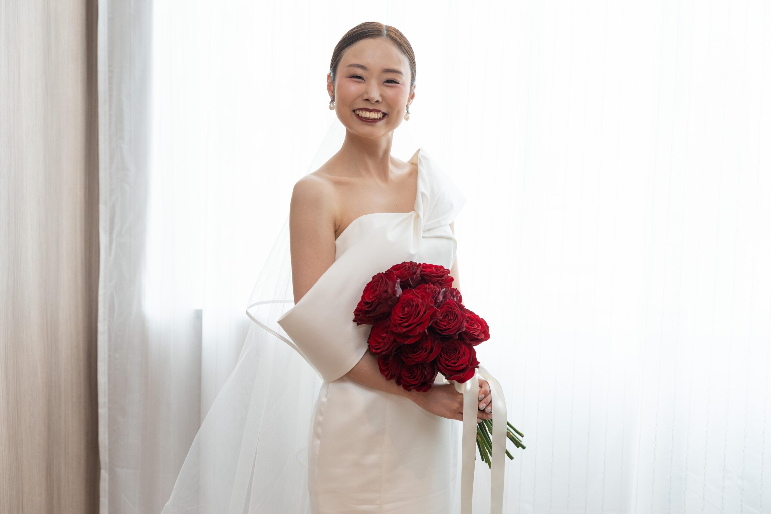 シンプルで洗練されたウェディングドレスには、真っ赤なバラのブーケをアクセントに。